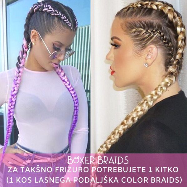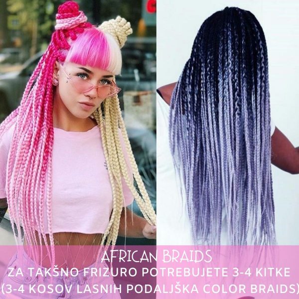 Lasni podaljški za spletanje kitk COLOR BRAIDS. Kitke so obnorele svet. Sedaj si jih lahko naročite tudi v Sloveniji! Ustvarite si popolno frizuro po vaših željah. Imate nešteto čudovitih možnosti. Ustvarite kitke boxer braids, corn braids, 2 veliki kitki ali nekaj majhnih kitk po celotnem lasišču, več kitk ob glavi ali pa ustvarite afriški stil kitk (african braids) po celotnem lasišču.
