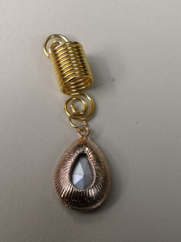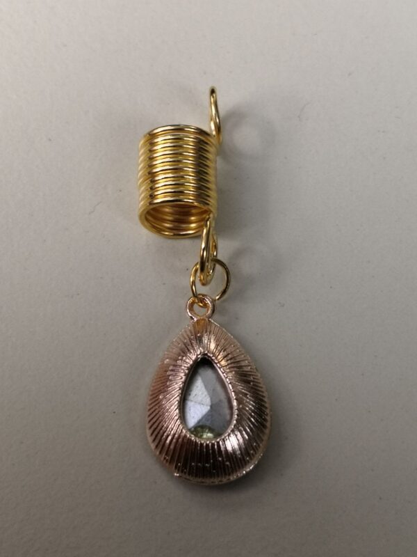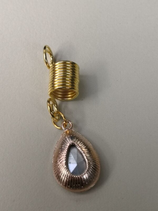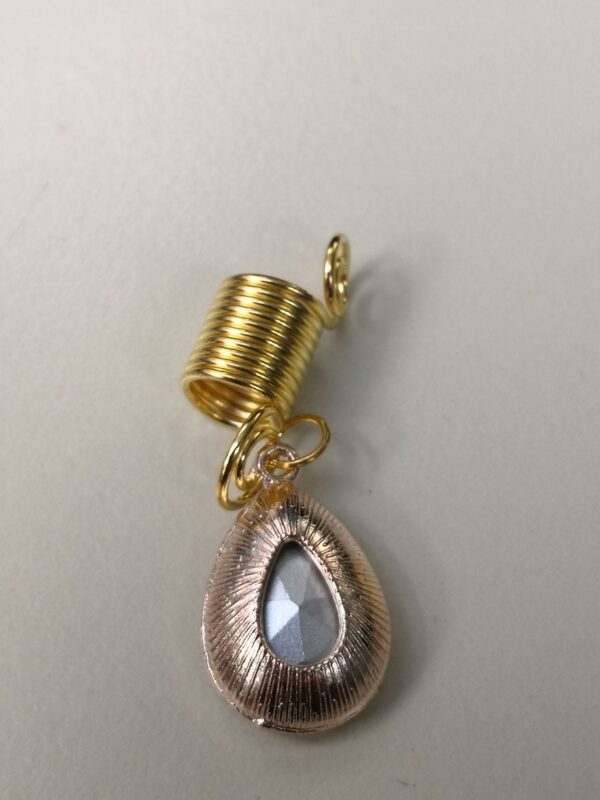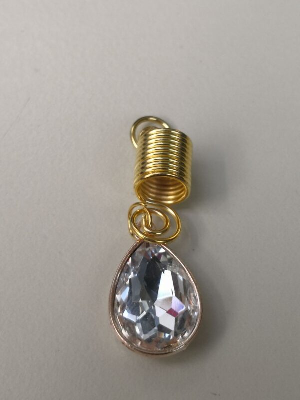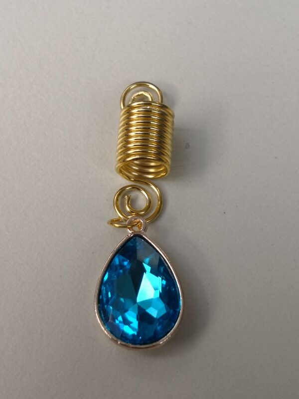 Pred tabo je nakit v katerem zablestiš…twister v zlati barvi z obeskom solzice iz kristala v beli, svetlo modri, temno modri in roza barvi. Nakit je iz kovine. Twister omogoča prilagajanje na velikost kitke (lahko ga raztegneš po obsegu ali dolžini ali pa zmanjšaš po obsegu ali dolžini glede na prvotno obliko ob prejemu). Nakit je zelo lahek, tako da ne predstavlja dodatne teže na glavi.
