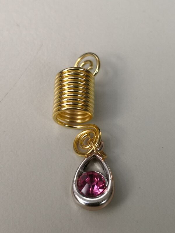 Pred tabo je nakit v katerem zablestiš…twister v zlati barvi z obeskom solzice in z roza kristalom v njej. Nakit je iz kovine. Twister omogoča prilagajanje na velikost kitke (lahko ga raztegneš po obsegu ali dolžini ali pa zmanjšaš po obsegu ali dolžini glede na prvotno obliko ob prejemu). Nakit je zelo lahek, tako da ne predstavlja dodatne teže na glavi.